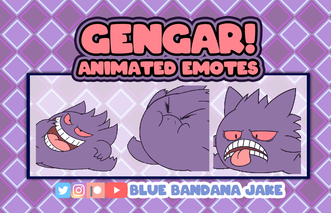 Three animated emotes for use on Twitch, YouTube, Discord or wherever else you want featuring Gengar, the fan favorite ghost type Pokemon laughing it up, doing a spit take and having a shocked reaction!